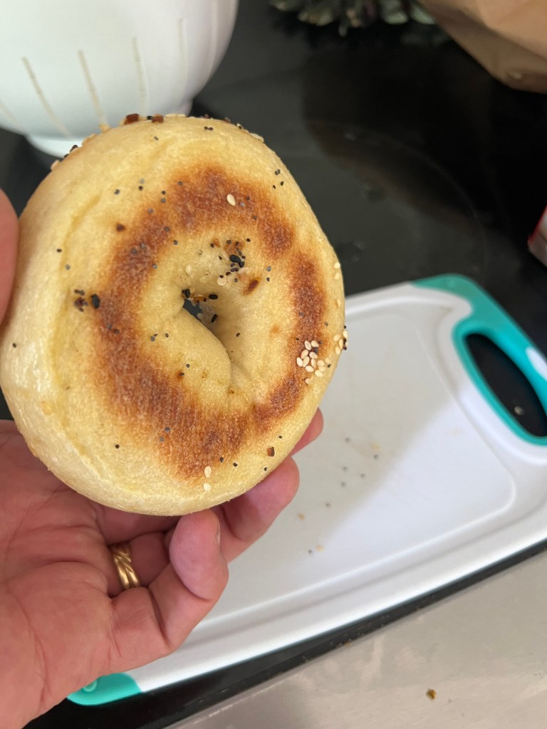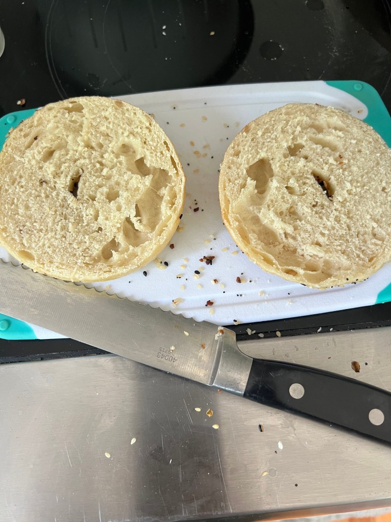 OK so I ordered one of each: Plain, poppy, everything, and sesame. To go. Dori admitted she made them last night so …. sigh, I lightly toasted it when I got home.