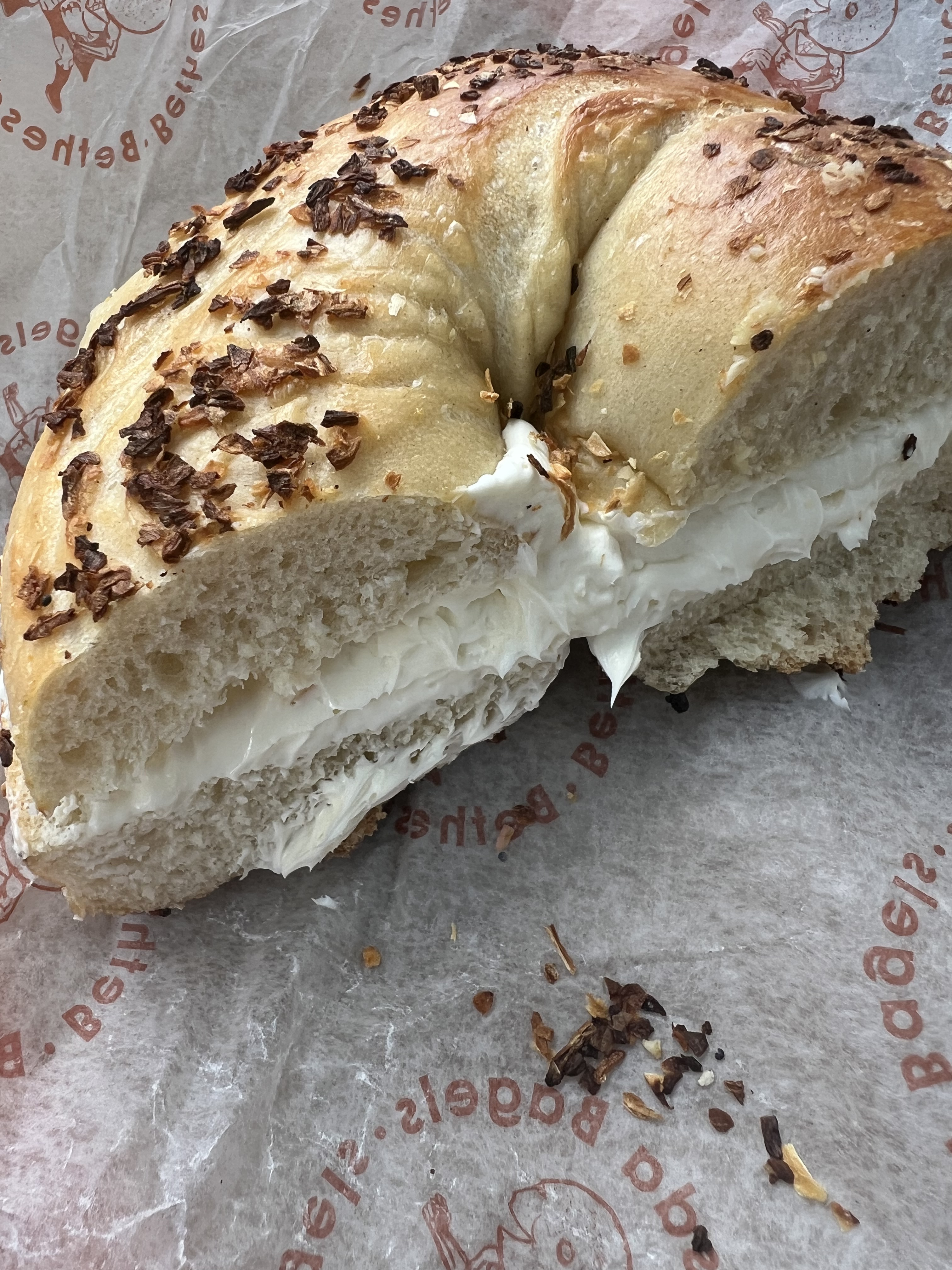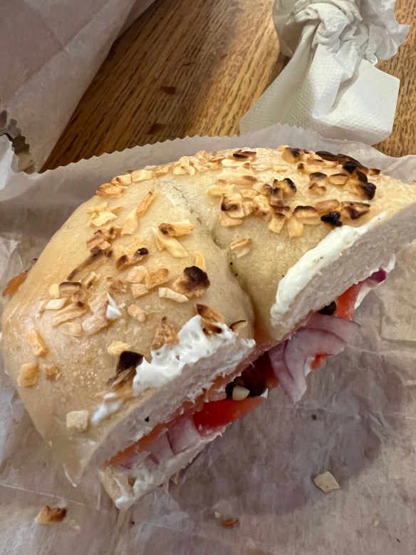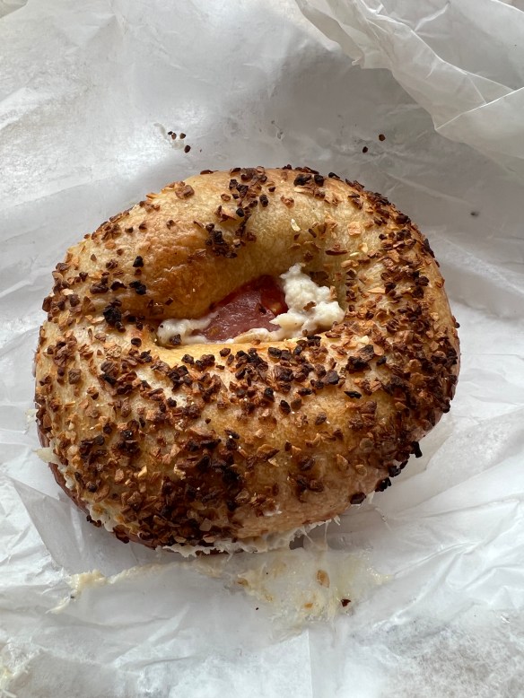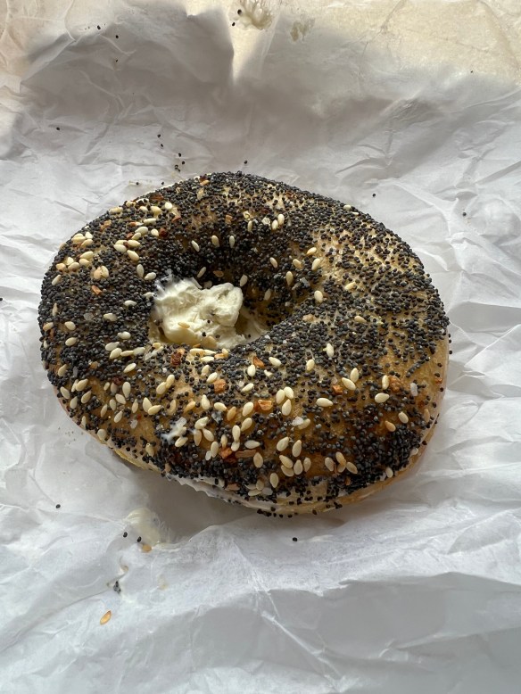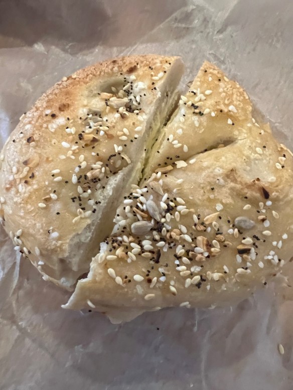Brooklyn Bagels was respectable enough. The bagels are large but not overly so. There was a thin skin but really no crunch. The flavor just …. neutral, nothing to write home or blog about lol. The toppings don’t really help because they are quite stingy. Here’s the everything bagel: