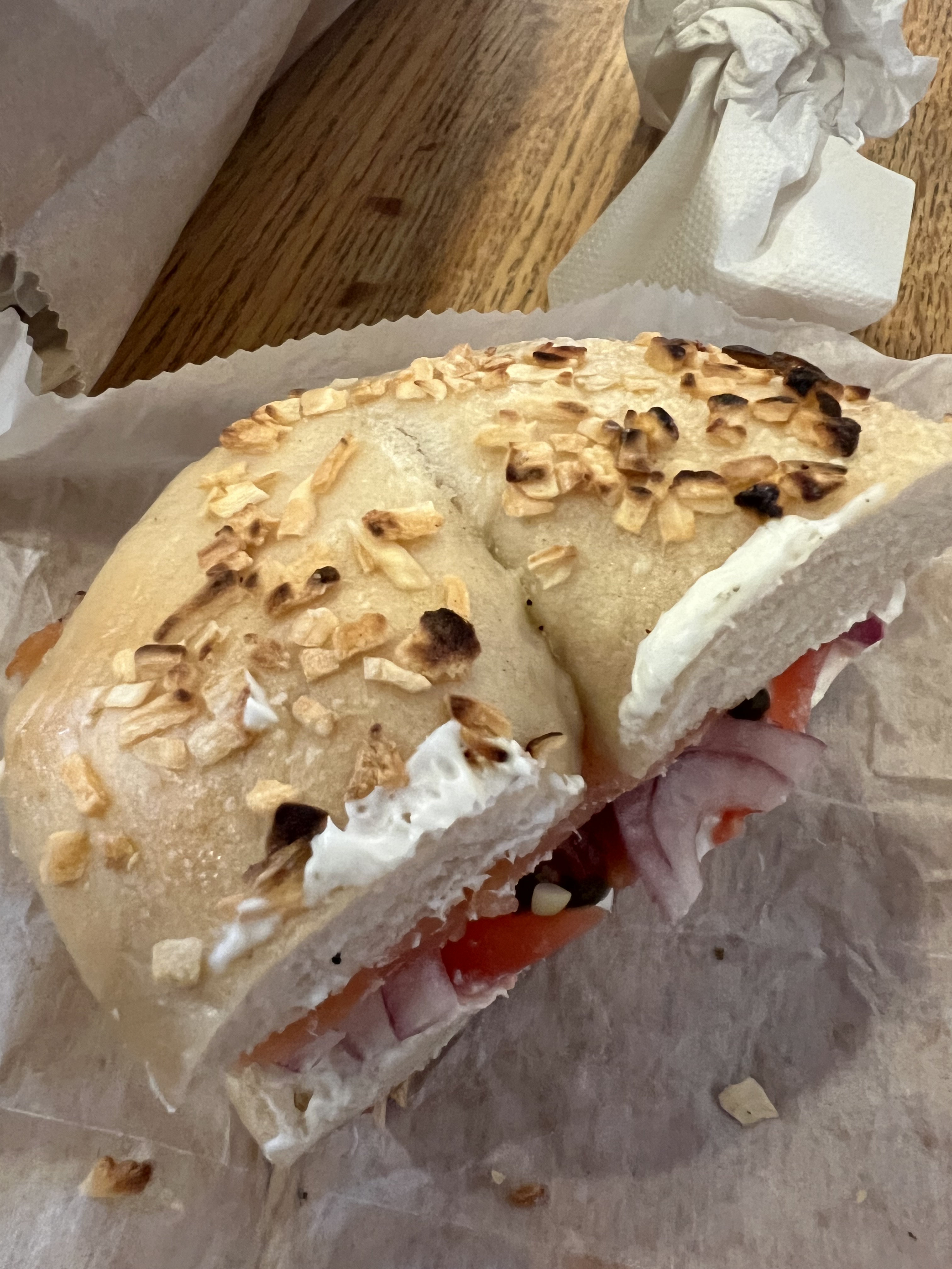 Here is the Onion bagel (with lox, capers, tomato and red onion):