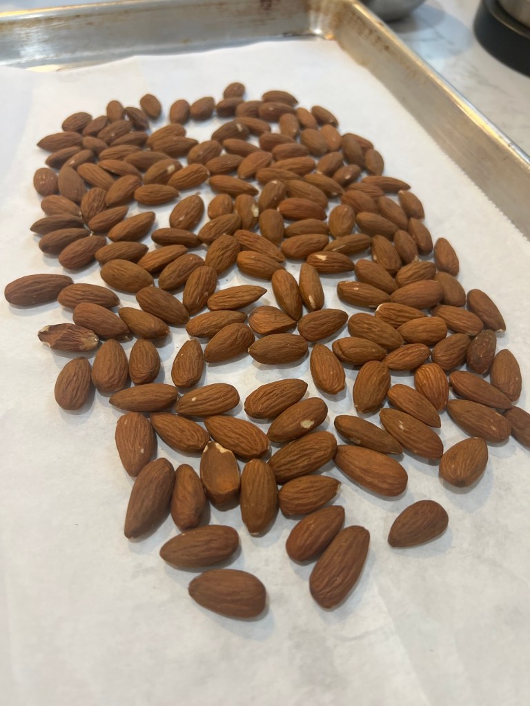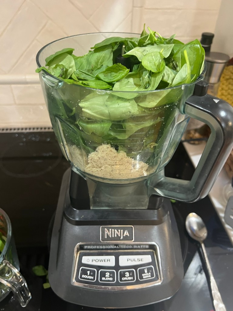 The first thing I do is toast almonds 6 minutes each side. I use almonds because they are less expensive than pine nuts and they taste amazing. Once they cool off, pulse them in the blender until finely processed.