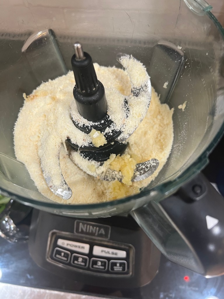 Next, add your garlic and Parmesan and pulse together for a minute.