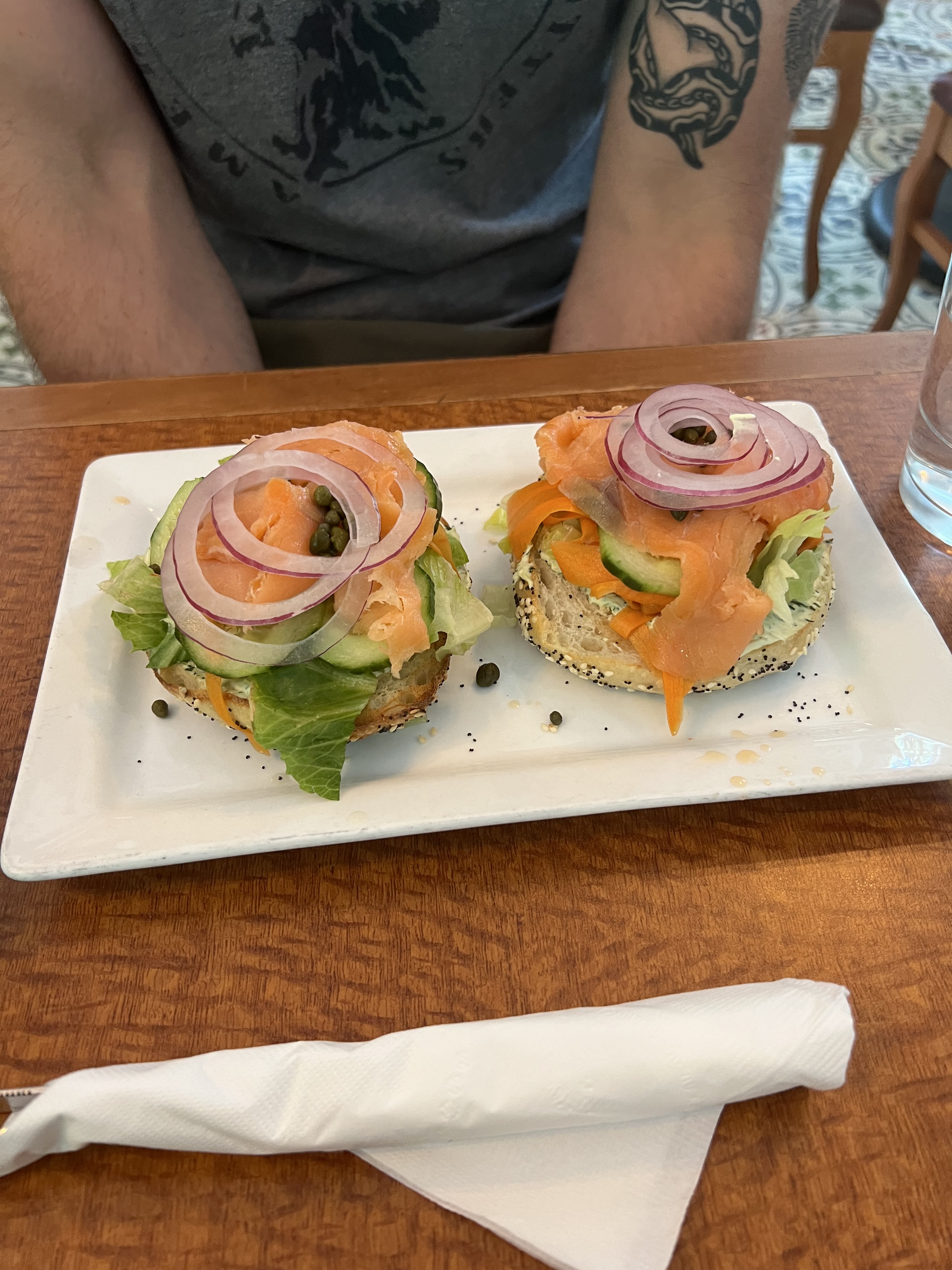 Here is the Onion bagel (with lox, capers, tomato and red onion):