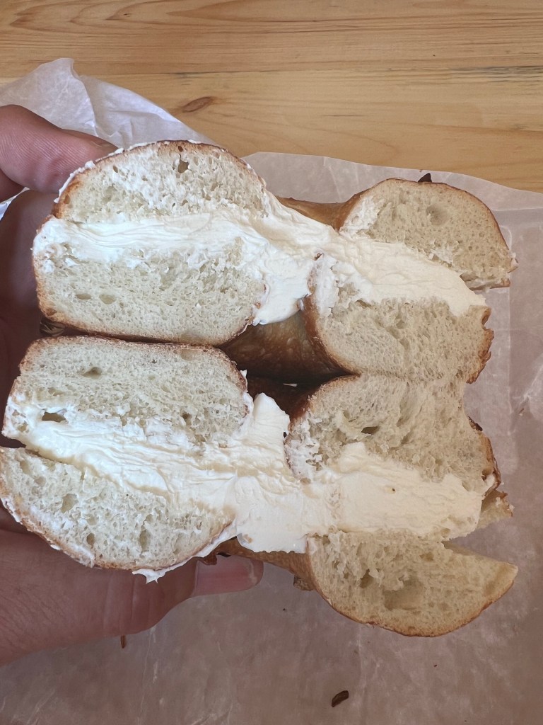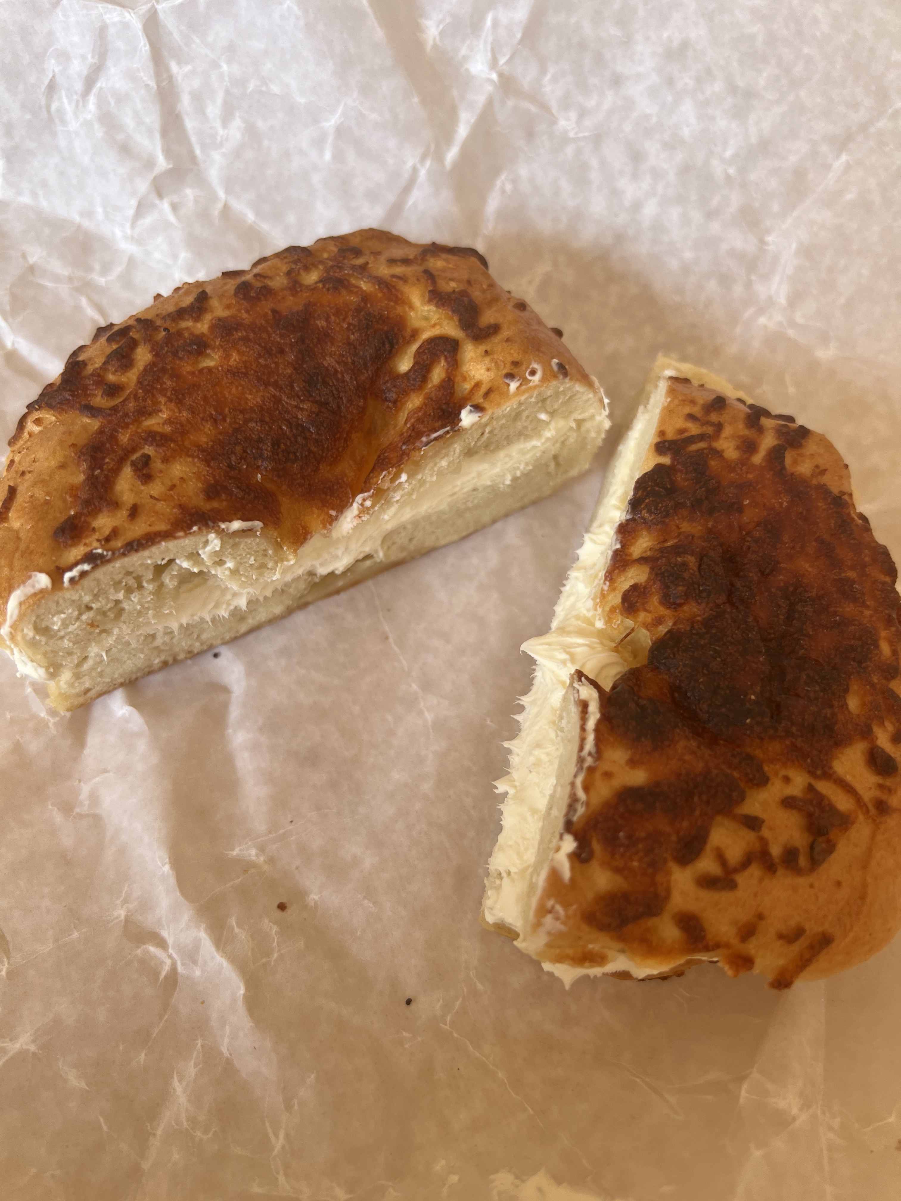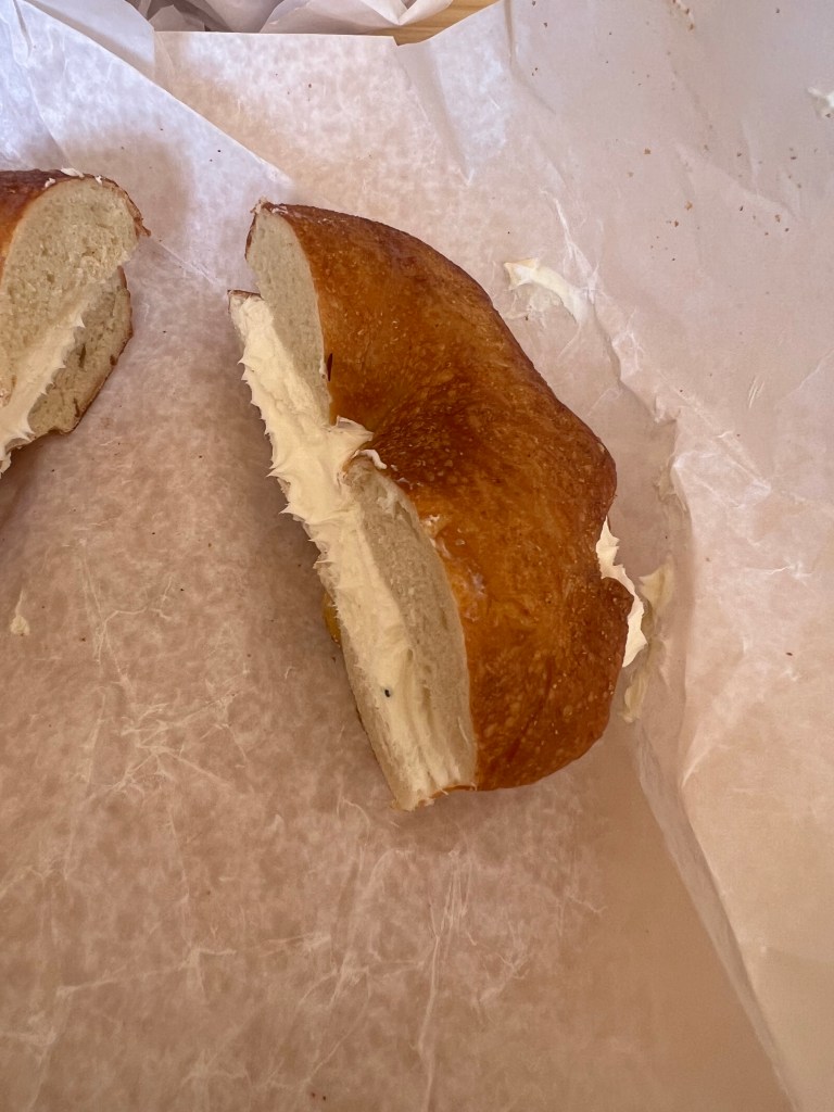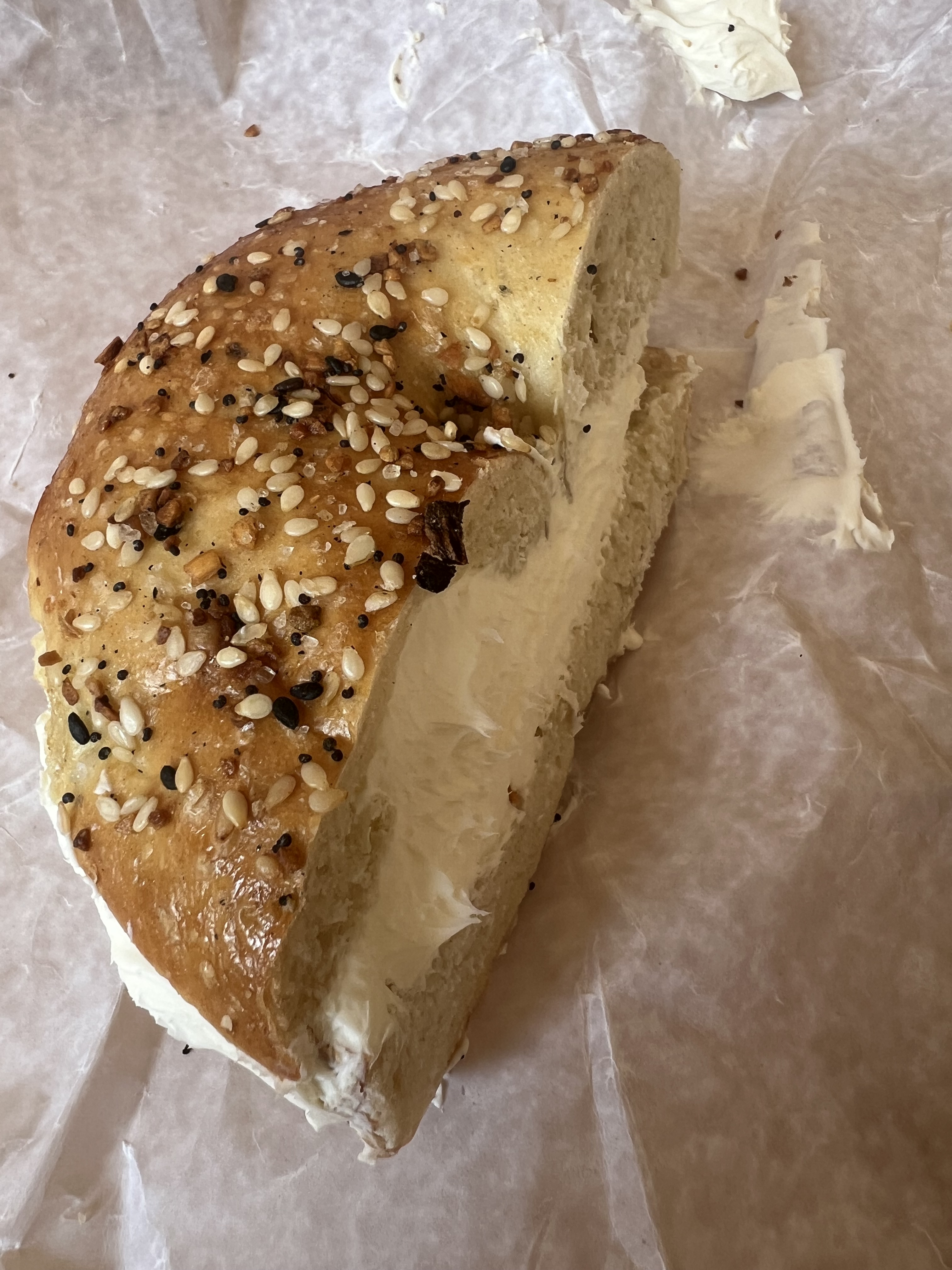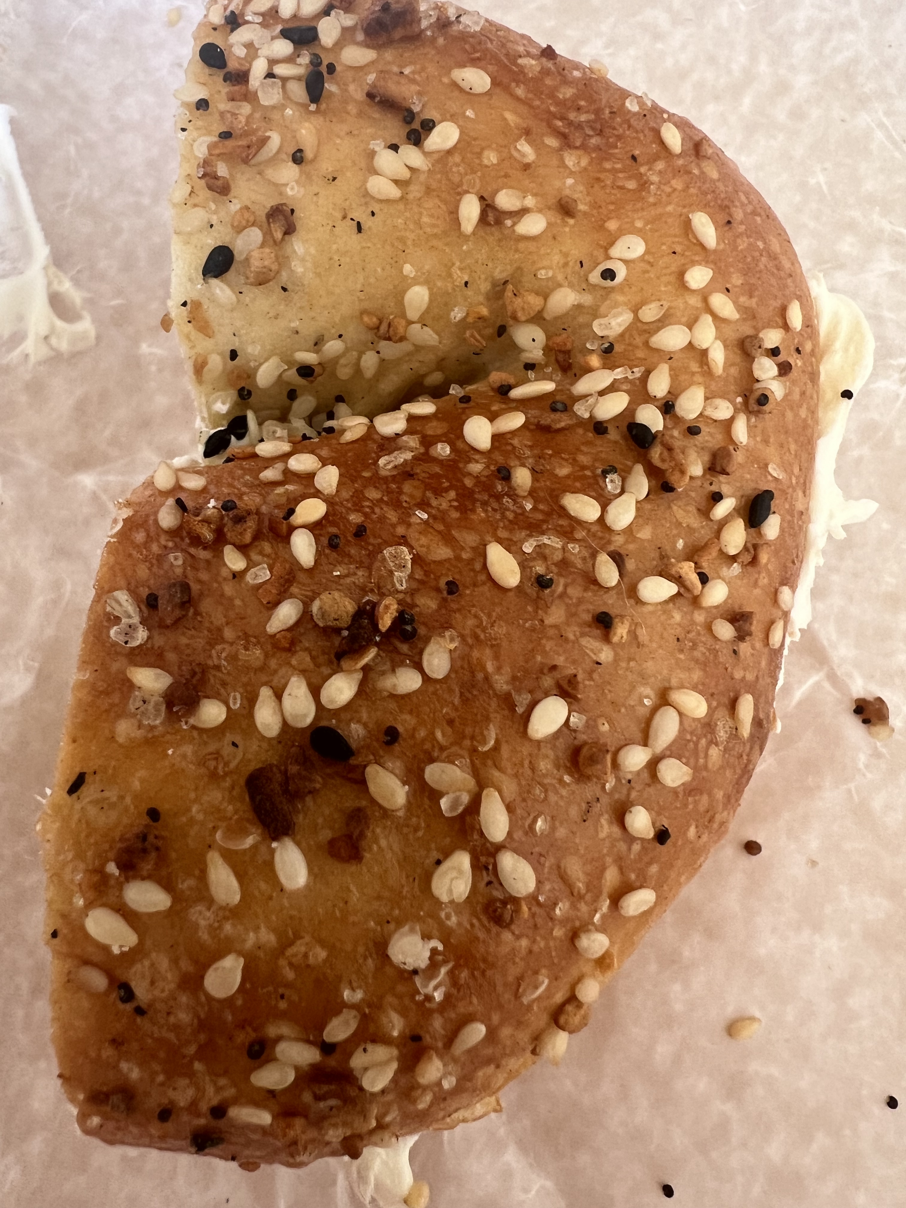 Brooklyn Bagels was respectable enough. The bagels are large but not overly so. There was a thin skin but really no crunch. The flavor just …. neutral, nothing to write home or blog about lol. The toppings don’t really help because they are quite stingy. Here’s the everything bagel: